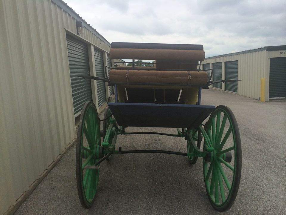 Dos-a-dos – ready to drive with your pair or four in hand. Made in England. Green gear, blue body, black stripe. completely rebuilt. Original wheel wrench. Hand and foot brake. Pair/four-in-hand pole. Seats four. Brown tweed upholstery. $5,500